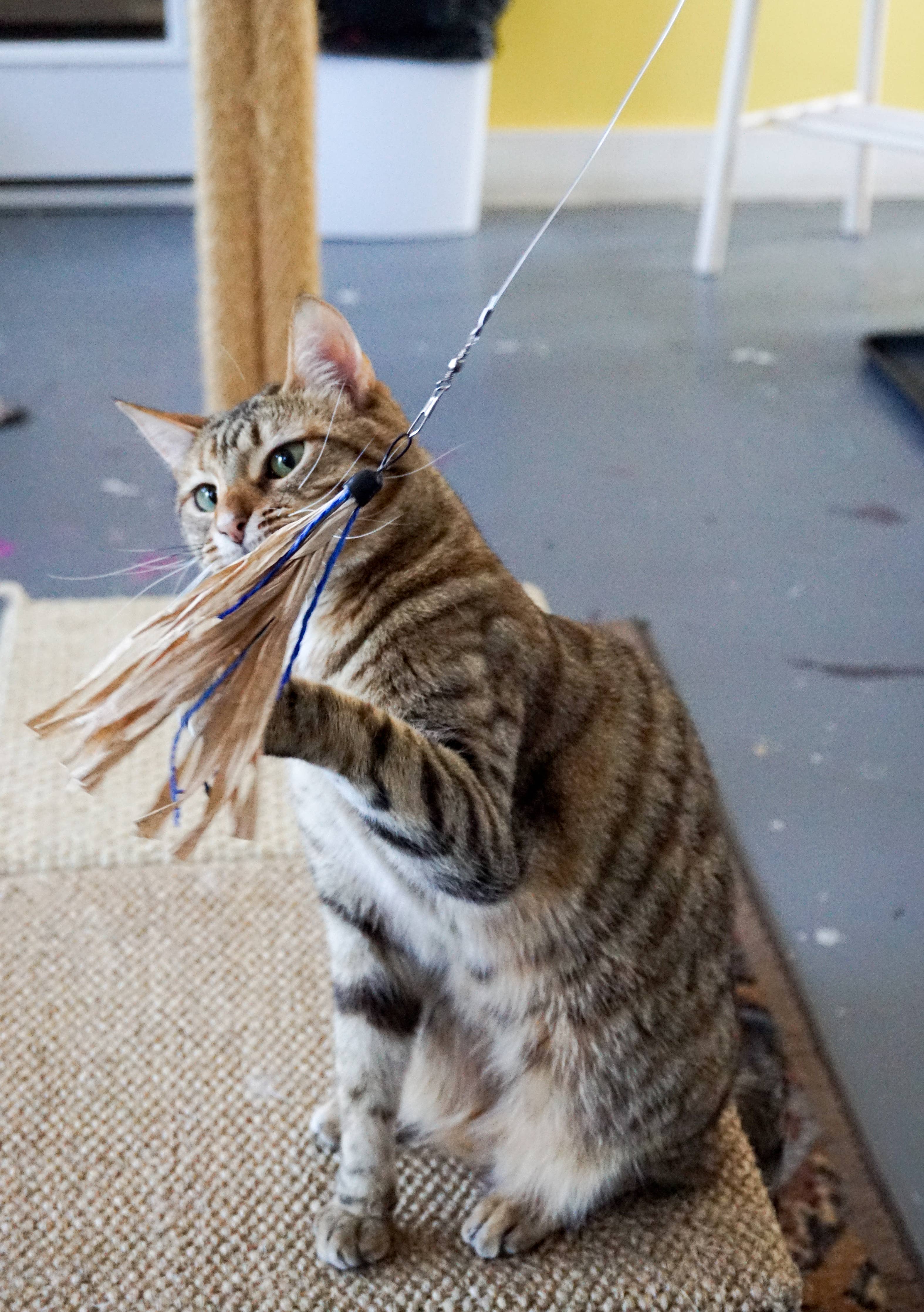 Handcrafted in the USA from eco-friendly, biodegradable paper, the Cuttlefish cat toy wand attachment is safe, chewable, and lots of fun. It sounds and moves like live prey flying through the air and cats find it irresistible to hunt, chase, pounce, jump and catch. The Cuttlefish is a NATURAL way to provide indoor enrichment and encourage cats to exercise and play. It attaches to the Wiggly Wand but can also be clipped to other similar wands.